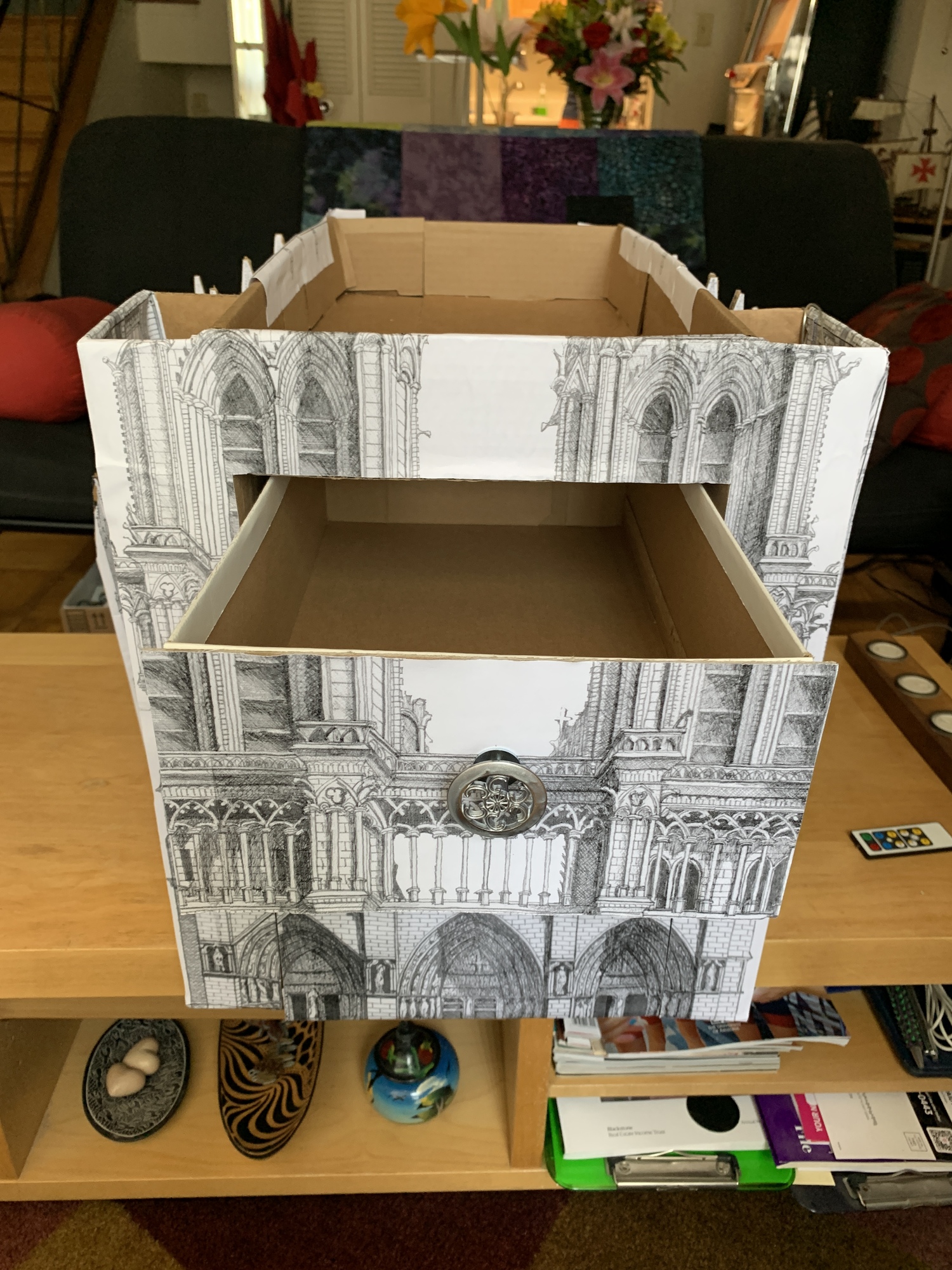 We had an old Quilted Northern box that could be the storage foundation. I found some high quality drawings of cathedrals online and mapped out the designs on the box.