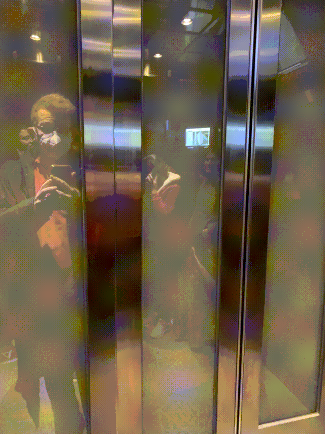 The elevator has opaque window panels, and you can see the building pass behind them.