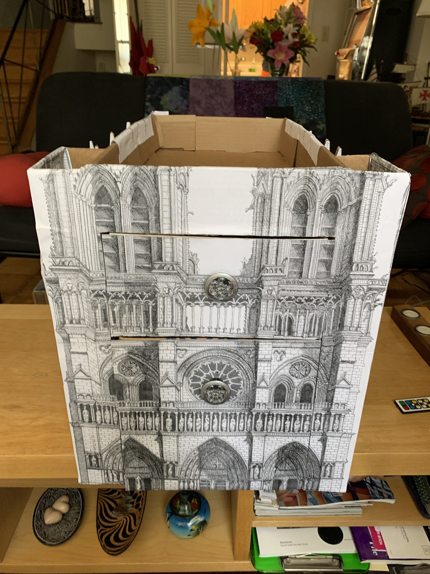We had an old Quilted Northern box that could be the storage foundation. I found some high quality drawings of cathedrals online and mapped out the designs on the box.